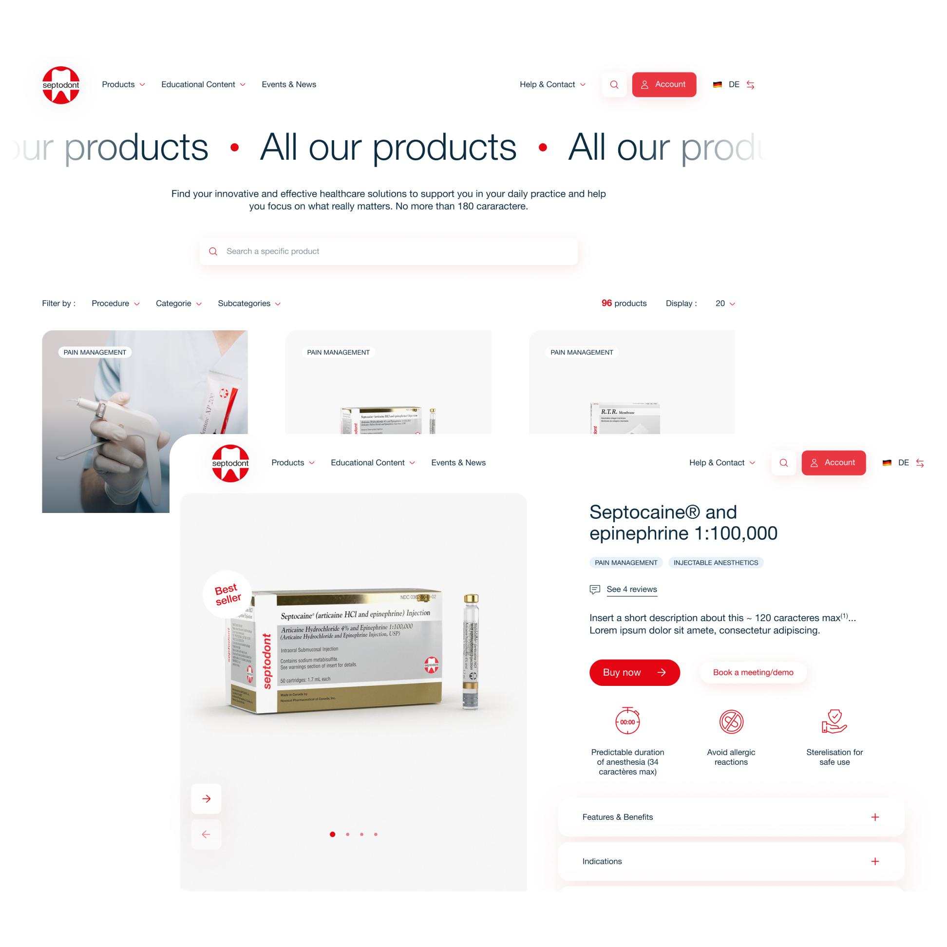 Suite à la refonte de divers sites d'innovations produits, Septodont souhaitait unifier son image à travers ses deux sites de marque : son catalogue commercial à l’international et son site corporate.